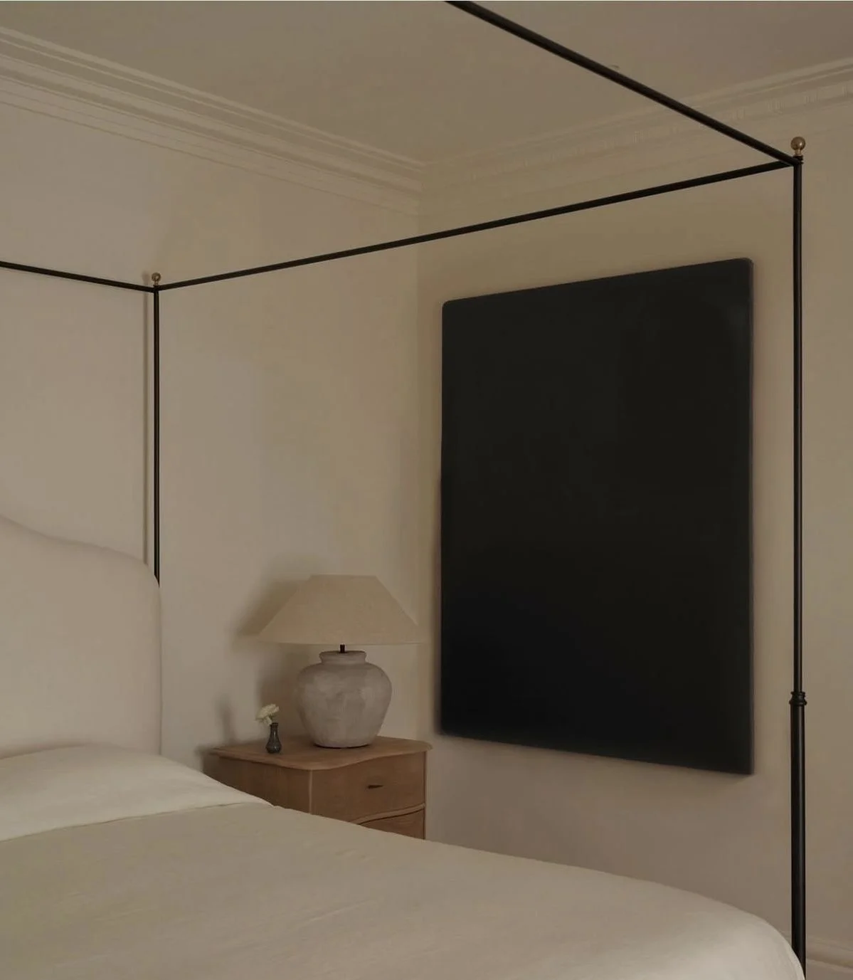 A hotel room with a bed, a nightstand with a lamp and small flower, and a large black frame or panel on the wall.